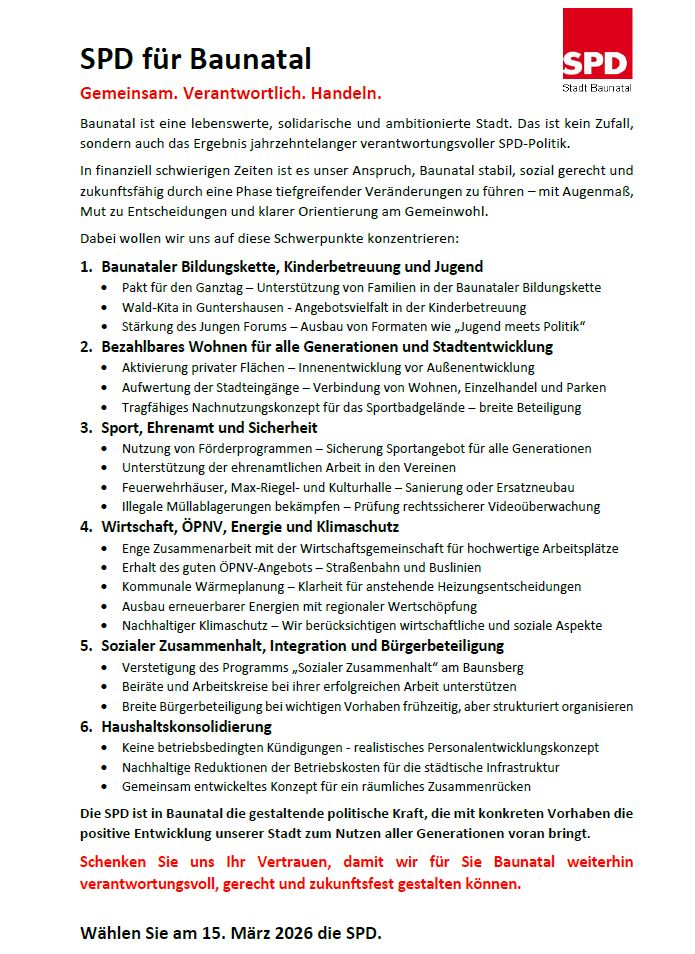 Die SPD ist in Baunatal die gestaltende politische Kraft, die mit konkreten Vorhaben die positive Entwicklung unserer Stadt zum Nutzen aller Generationen voran bringt.